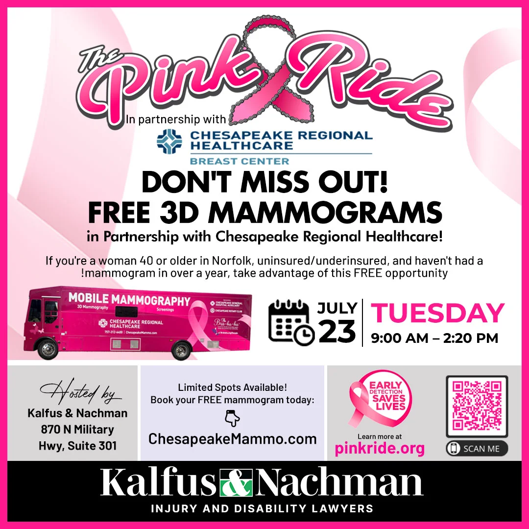 In a powerful collaboration to promote women's health, Kalfus & Nachman has partnered with Chesapeake Regional Healthcare Breast Center to host The Pink Ride, offering free 3D mammograms to underserved women in the Norfolk community. The event will take place on July 23rd, 2025, from 9:00 AM to 2:20 PM at our Norfolk office, located at 870 N Military Hwy Suite 301.