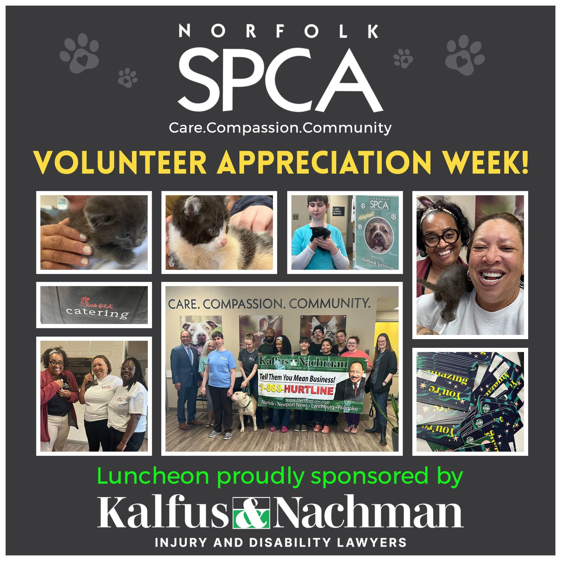 Each month the Norfolk SPCA Adoption Center picks a pet and we highlight them in or monthly newsletter. The firm also pays for all adoption fees for our furry friend of the month.