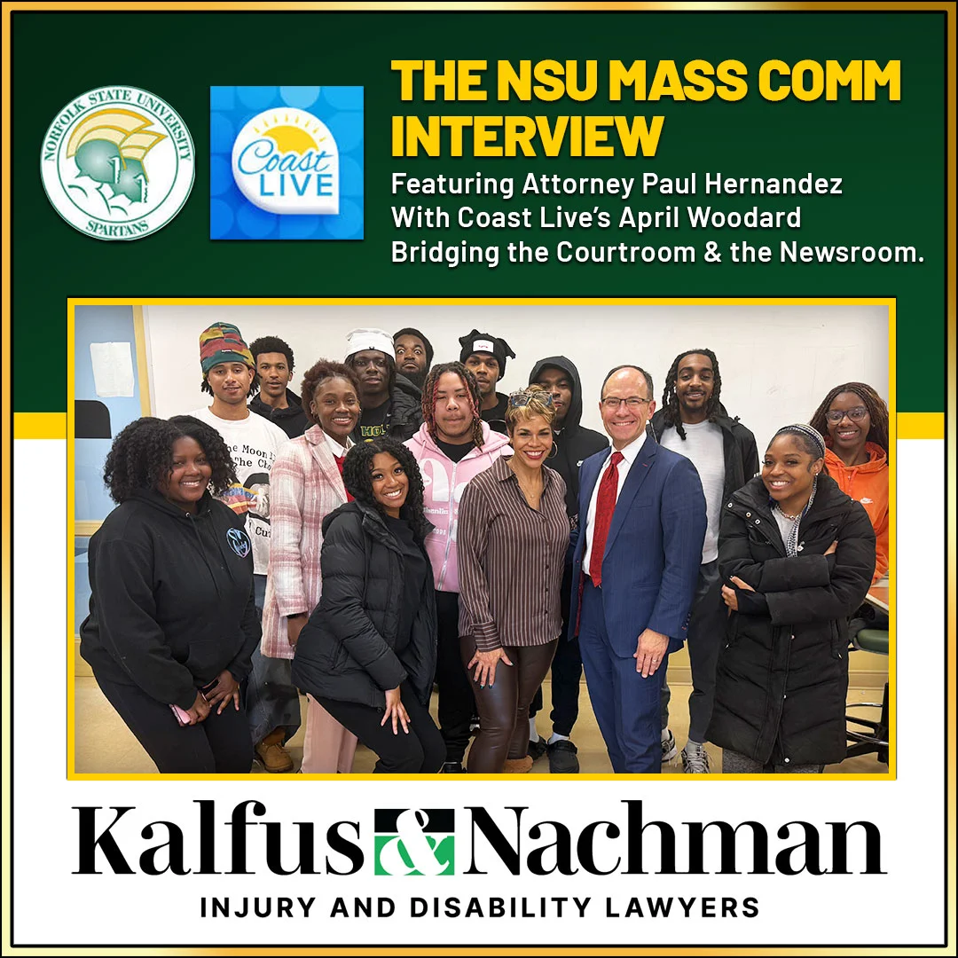 Kalfus & Nachman Personal Injury Lawyers recently had the privilege of visiting Norfolk State University (NSU) to connect with students in the university’s Mass Communications Department. Our team spent an engaging and inspiring day on campus, where Attorney Paul Hernandez participated in a live, in-class interview led by students in April Woodard’s journalism course.