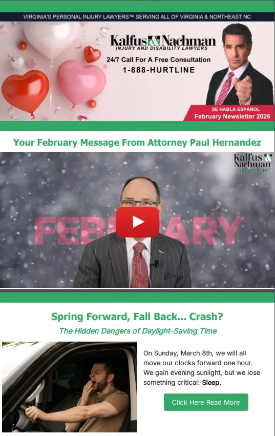 At Kalfus & Nachman PC, our personal injury attorneys represent clients from Norfolk, Newport News, Roanoke and nearby areas of Virginia. We care about our community and want to keep you up to date on important information. In our monthly newsletter, you'll find a vast array of news you can use. We let you know about seasonal safety tips, give you our opinions on timely topics, let you know when you can watch us on the Hampton Roads Show, and tell you about upcoming community events. Check out the latest issue or browse through older editions.